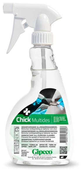 Bruksanvisning: Spraya Chick MULTIDES på ytan. Torka sedan rent med torr duk